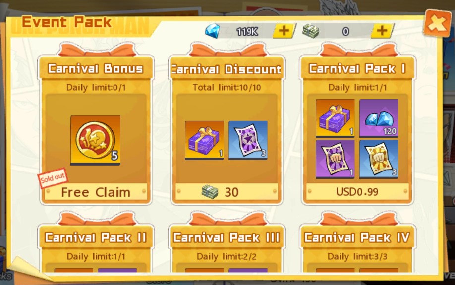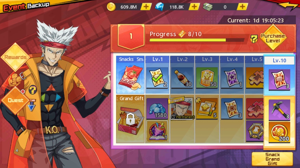 You can buy levels by using funds, by clicking Purchase Level. Alternatively, you can also use your Backup EXP cards that you can get free from the quests. Do note that there are daily and weekly quests, so make sure to try to do them all! There’s also a ‘Snack Grand Gift’ which you can buy for USD$23.99 for 10 BTs, 8 UR Hero omnishards, 6 UR Monster omnishards, 1580 gems, garou figurine and a cosmetic badge.