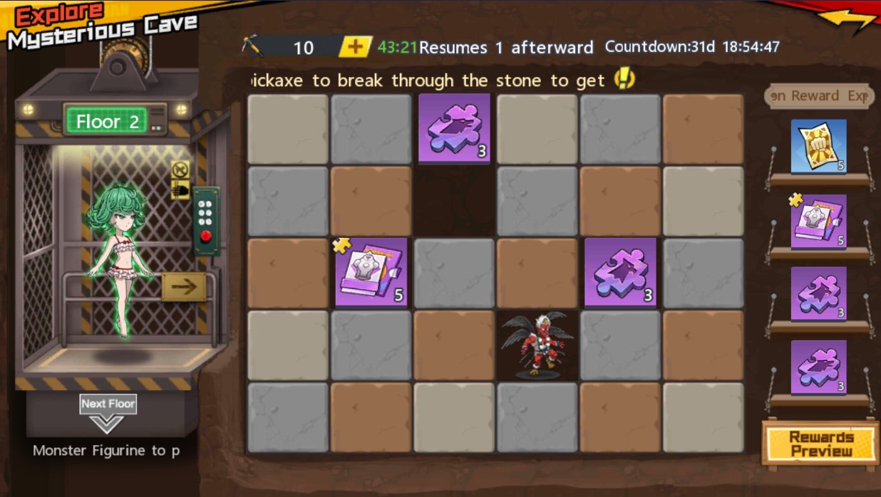 Use pickaxes and break the squares to reveal rewards or monsters. The goal is to find the monster figurine, and then break it to advance to the next level.