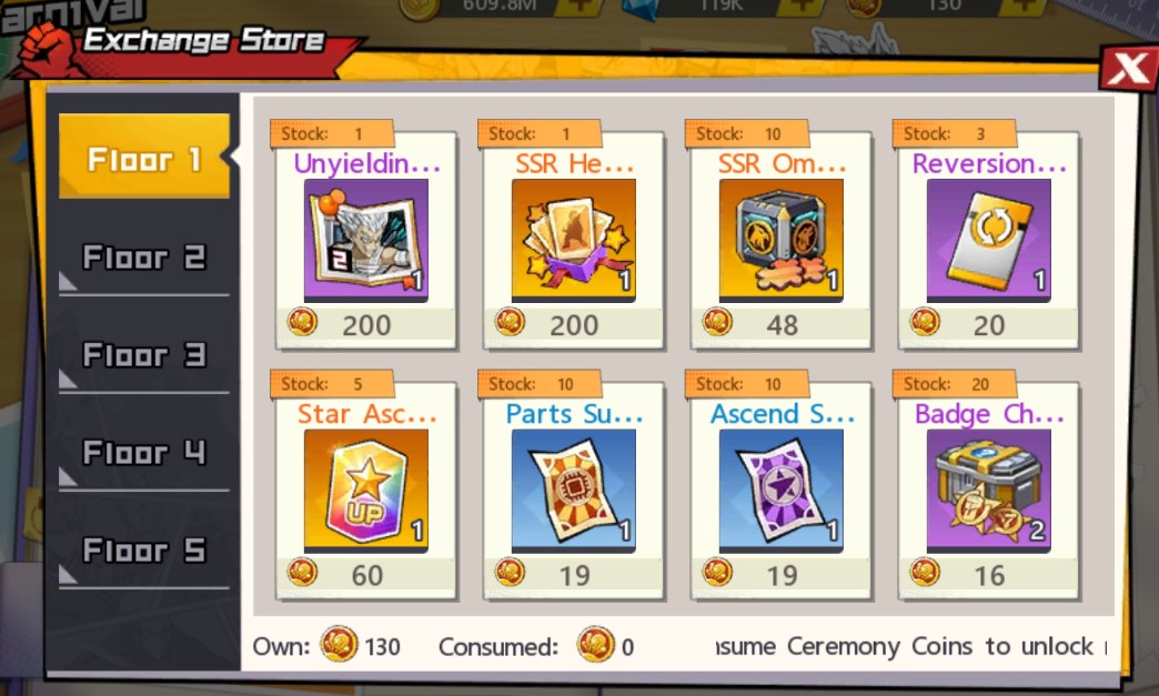 - Floor 11-20: Elite voucher, orange gear fragments, SSR omnishard, gems