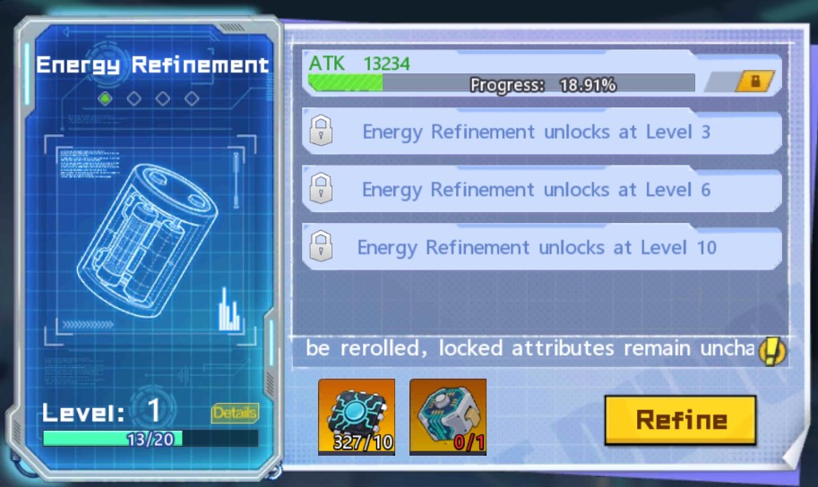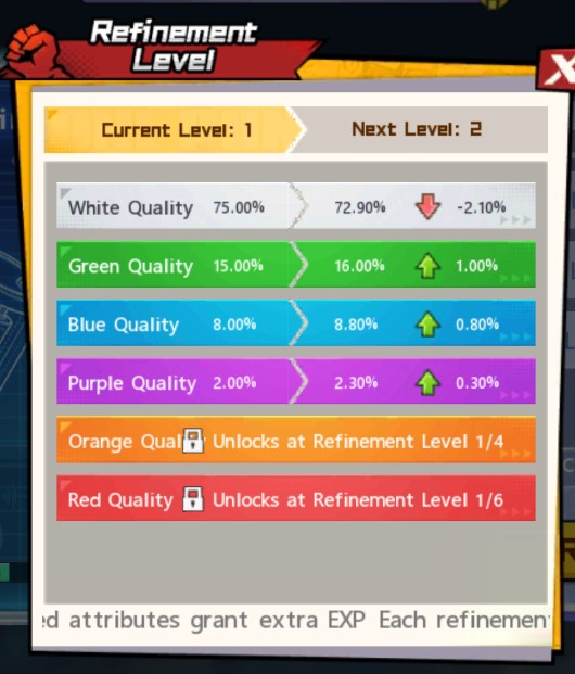 But anyways, just click Refine to reroll the stats, but also gain Levels. Each time you refine, you +1 XP. So at the start you’ll want to focus on just levelling up (spamming refine) instead of choosing the right stats, since you can’t lock anyways. To refine you’ll need Refinement chips, which you get from HEROIC Expedition under the same Training Center.